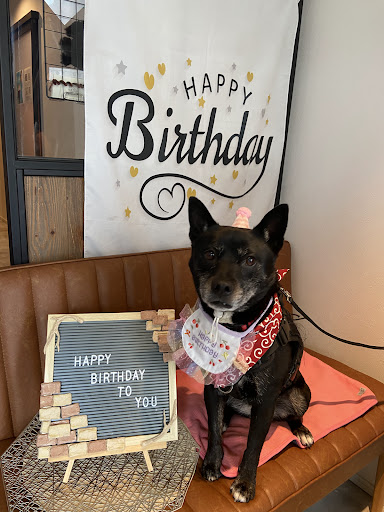 Our dog Roxy turned 6 today and we took her to celebrate at the cafe! The employees were so kind and Roxy really liked them. She enjoyed her food very much (steak and hijiki hamburger) and when we told the employees that it was her birthday they set up a whole photo shoot for her with props and music. Our older dog could not make the walk to the cafe so they gave us some treats to take home for him. He loved them so much he tried to eat the bag. 😂