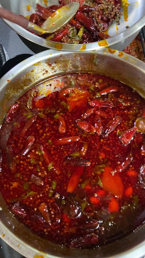 コントでしか見たことがない無骨な大きな鍋には、赤唐辛子がたくさんの真紅に染まった火鍋のスープが並々注がれており、見るからに辛そうに見えるのですが、具材をどんどん投入していけばスープに旨みがどんどん蓄積される無限旨辛仕様。