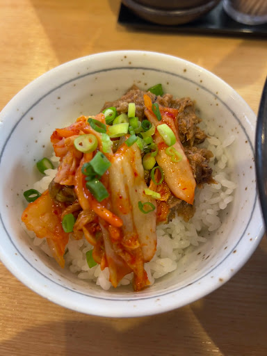 次にさんまキムチご飯。 キムチとさんまのフレークを混ぜたような具材がご飯にのっており、色合いからして辛そうだなと身構えつつ口に運んでみると、辛みはそれほど強くなく、発酵の酸味とさんまの旨みが合わさった独特の味です。 刺激を求める方には物足りないかもしれませんが、ラーメンのスープを一口飲んでご飯をかき込む流れが心地よく、あまり味が重ならないので食べやすかったです。味の濃厚さを期待するとやや肩透かしかもしれませんが、ラーメンの合間に箸休め的にいただくにはちょうどいい塩梅だと思いました。