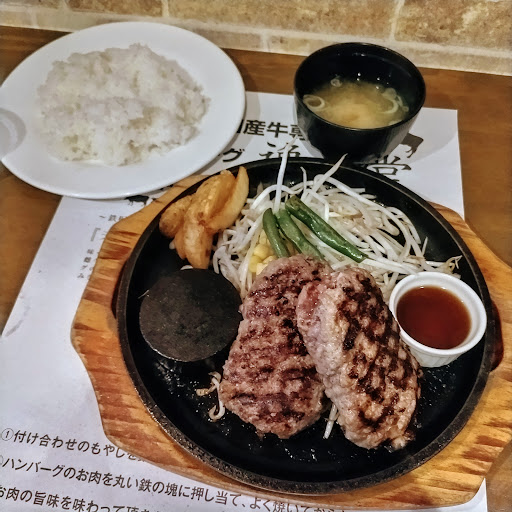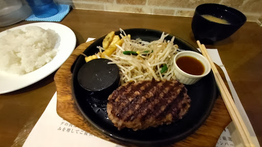 Read more少し大きめのハンバーグ(グラム数忘れました…)をニンニク醤油ソースで食べました。 外は焦げ目がつく程度で、中はほぼ生の緩い柔らかいハンバーグです。熱々鉄板に置かれ、熱々の石と生の細めのもやし、コーン、ポテトそして小さめの容器に入ったソース(7,8種類から注文時に選択)が添えられて出されます。もやしにお好みで塩胡椒して混ぜて火を通し、柔らかいハンバーグを箸で一口サイズに取り分けて、熱々の石に置いてジュ~してソースにつけて食べます。同じソースならば一回だけおかわり無料、石は冷えたら取り替えてくれるそうです。(私はおかわりも取替もしたことないです) 肉はお店曰くかなり良質とのことですが、ハードなハンバーグが好きな人、レアが苦手な人、面倒くさがりな人は気に入らないかも。