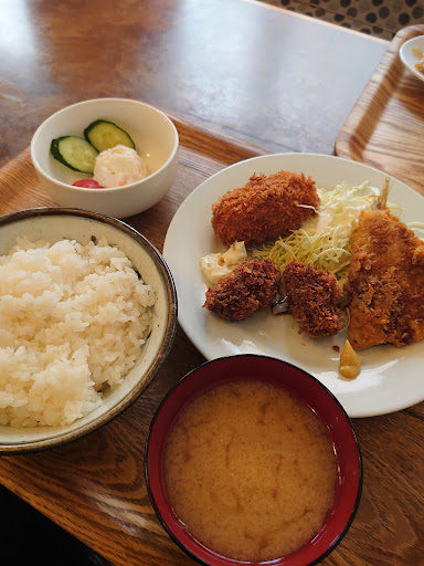 私はBセット ¥850円で 揚げ物のプレートを頼んだ メンチ、クリームコロッケ カキフライニコ、キャベツの千切り添