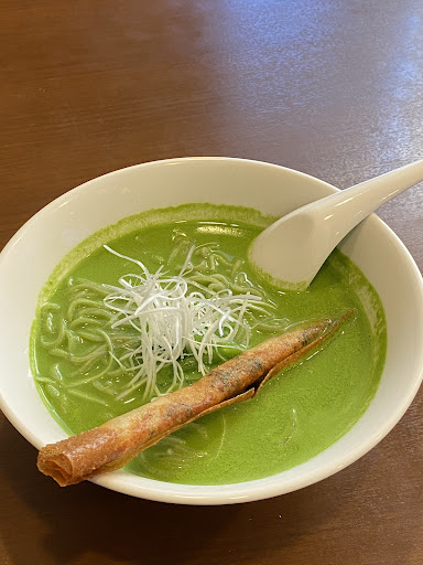 緑色のラーメンは小松菜を使ったスープのラーメンです。どんな味なのか予想がつきませんでしたが、一口スープを口に含んでみると、とてもクリーミーで洋食のような味です。ポタージュにイメージが近いのかなと思います。麺にも小松菜が練り込まれており緑色の麺です。 トッピングに乗っている細長いものは春巻きのようなもので、さくさくして中に具が入っています。これもとても美味しかったです。