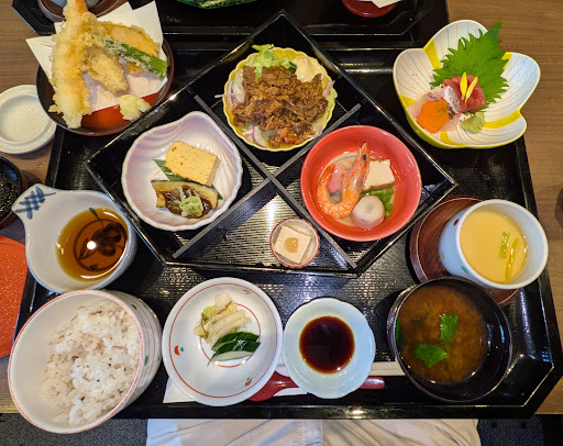 (以下、25年春) ランチメニューから、馬籠(+茶碗蒸し330円)をチョイス。 大きなトレーに乗せて、一気に配膳されるが、内容はミニ懐石のよう。小鉢(胡麻豆腐)、替皿(出汁巻き卵、茄子の田楽)、蒸し物(炊き合わせ)、焼き物(牛焼肉)、造り(鮪、鯛)、揚げ物(海老、南瓜、ししとう、うど?)、味噌碗(赤だし)、ごはん(白米か十六穀米を選択)、香の物と盛り沢山である。男性でも満腹になるだろう。税込2000円以内でこの内容はなかなかだと思う。 こちらの店は、熱いものは温かく、冷たいものは冷たくと、器も含めて適温で供されるのもよい。料理の味付けは文句無し。食後には煎茶のサービスも。 座席数は多いが、昼時や休日の夜は満席となることも多いので、飛び込みだと待つことに。公式サイトか電話での予約を強くおすすめする。 なお、会員登録すると家族も含め誕生月には2ヶ月間有効の特別コースや特典付きの案...