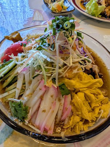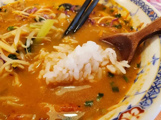 The Dandan noodles are mildly spicy. The spiciness comes through afterwards. I would like to see a spicy version for people who like spicy food. It is topped with a heap of leafy vegetables from the local Funabashi area. The crunchiness of the vegetables is unusual for Dandan noodles, and you can also enjoy the crunchiness! It is also exceptional to dip the rice I order additionally in the soup of the Dandan noodles.