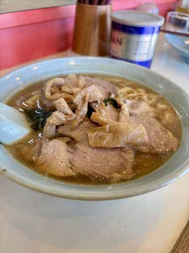 Read more・チャーシューメン¥600+大盛り¥100 普段あまりチャーシューメンは選ばないんですが、このお値段ならつい試してみたくなってしまいました。しかも大盛り。やや小ぶりな丼になみなみと盛られた一杯は、まるで屋台のどんぶり飯のような迫力。肉肉しいチャーシューは食べ応えがあり、中細麺を勢いよく啜れば思わず笑みがこぼれます。古びた店構えから老夫婦の営みを想像しましたが、実際はおっちゃんのワンオペ。二代目なのかは謎です。昼時は片付けが追いつかず、空いた丼がカウンターの隅に窮屈そうに並んでいました。