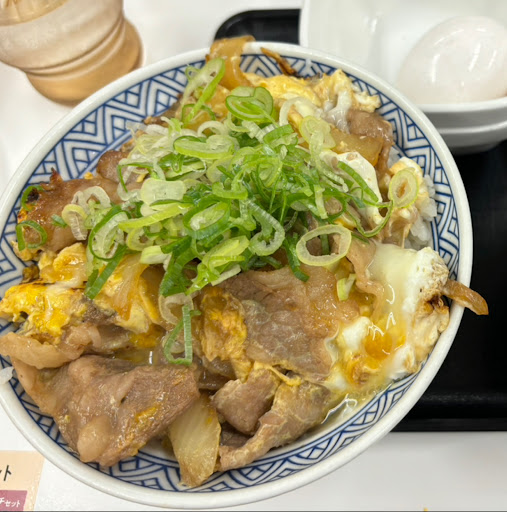 期間限定の牛とじたまご丼を注文したが、卵が混ざりきっておらず、火を通しすぎて焦げた白身がところどころに。