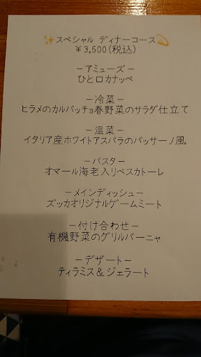 秋元シェフのズッカ復活❗高根公団にズッカが戻って来ました。渋谷のお店も続け、週に何日か高根公団に来るそうです。ワインはリーズナブルで美味しく楽しめます。 月1のスペシャルコース。今回10月は当日私が急に体調が悪くなり、泣く泣くスペシャルディナーをテイクアウトしました。お願いしたところ、シェフに快諾して頂けました。アミューズは新秋刀魚のカルパッチョ秋茄子のマリネ添え、冷前菜はあん肝のテリーヌ、温前菜は松茸入りキノコのフリット、プリモピアット ズワイガニとキャビアのパスタ、メインディッシュが仔羊のローストです。テイクアウトしたとは思えないほど美味しかったです❗ 7月のアミューズは夏野菜のゼリー寄せテリーヌ仕立て、トリュフソース牛ヒレ肉のカルパッチョ、殻牡蠣のパポーレ、ラビオリ、骨付き子羊のロースト、ハニーマスタードソース、ドルチェです。夏野菜のゼリー寄せは見た目も夏らしく程よい酸味で眼と舌の両方で食欲をそそります。牛ヒレ肉のカルパッチョは美味しくて美味しくてあっと云う間に食べ終わり後悔しました。牡蠣は夏野菜のソースで美しく旨い❗ラビオリは肉汁が飛び出す美味しさをゴルゴンゾーラかトマトソースで楽しめます。骨付き子羊のローストはボリュームたっぷりで肉の味わいがたまりませんでした。 6月は魚づくしスペシャルです‼️前菜はビワマスの二種類のカルパッチョとタコとオリーブと季節の彩り野菜のマリネです。琵琶湖の稚鮎を食べて育った貴重なビワマスを贅沢に使い、塩とレモンで甘味が引き立つ逸品とねっとり濃厚な味わいのカルパッチョで頂きました。タコとオリーブと彩り野菜のマリネは見た目も夏らしく食欲をそそります。実際、酸味が程よくタコの甘味とオリーブの塩味とベストマッチです。温菜は鱧のフリット梅肉ソース。関西では夏といえば鱧です。サクサクのフリットに甘酸っぱい梅肉ソースは意外な組み合わせだと思いましたが、これまた美味しい‼️メインは梅雨イサキのセモリナ粉ソテーカポナータ添え。カリカリサクサクの歯応えとカポナータの風味が何とも言えません。パスタは入梅イワシとウイキョウ松の実のシチリア風です。複雑な味わいで初めての経験でした。お腹いっぱいです。ワインはコースに合わせたマリアージュで楽しみました。大満足です。 前回5月は和牛のスペシャルディナーコースでした❗サーロインの炙りカルパッチョ。牛タンのピッザ職人風。和牛トリッパと根菜のジェノベーゼ。牛すね肉のボロネーゼ。和牛フィレ肉の赤ワインソース。前菜からオリジナリティ溢れる料理が楽しめました。おまけにカレーのお土産つきです‼️これがまた辛くて美味しかったです😁 以前のアラカルトでは、北海道産の牡蠣は生では爽やかで塩分も程よく、焼きではプリンとした食感が何とも言えません。カルパッチョは秋元シェフの懐かしい味です。野菜のフリットはサクサクで野菜の旨味とマッチしてます。シーフードのアヒージョはウツボでした。フィメドポアゾン仕立てで流石でした。四万十川産の鮎のムニエルは秀逸‼️美味しくて黙ってしまいました。ローストビーフはしつこくなく、柔らかく肉の味は濃厚です。ドルチェは懐かしのズッカのケーキとアッフォガードを頂きまし...