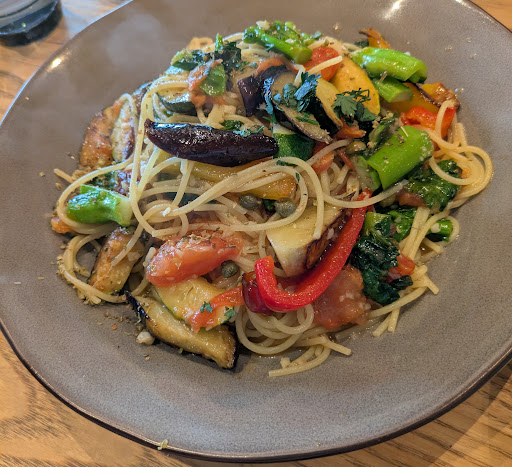 グリル野菜🥦🍆🍅は旨味が凝縮して、かなり美味しい!PIZZAも上にのっている鶏肉が香ばしく、さすが窯で焼かれているだけあって味が違う! 生地ももちもち!🥚も掛かっていて親子丼から構想を得たとのことらしい。 dadada代表する一品だけあって食べごたえあり、大満足のPIZZAだった(о´∀`о) しかし、パスタ🍝は可も不可もなく、うーん少々いまいち…かな😓であった。
