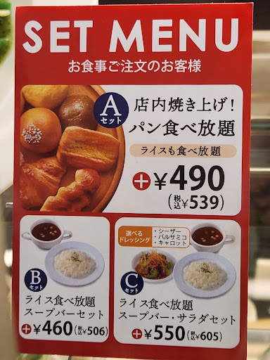が、セット構成に「ライス食べ放題+スープバー」はあっても、「パン食べ放題+スープバー」の組合せがありません。この組み合わせにしたいなら更に「+スープバー」を追加するしか無い。(パスタ主体のメイン料理にライス食べ放題!って違和感あるなぁ…肉メインなら良いけど) 店頭にはスープバー/ドリンクバーに関する追加料金表示が何故か無かったので、参考までに店内卓上のオプション料金表示の写真を掲載しておきます。
