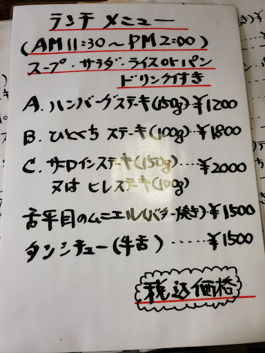 Read more以前より富津のイオンモールに行く途中、住宅内に割と目立つ看板が気になり、やっと営業時間と合ったので、平日ランチタイム時に伺ってみました。 先客は一組2名でしたので、カウンターに着座し、ランチメニューのサーロインステーキ¥2000のセットメニューを注文。 先に、コーンスープ、サラダが出され、数分でステーキ、ライスが。 サーロインステーキは150グラムでしたので、あまりボリューム感は無かったのですが、柔らかくまずまず!といった感。 付け合せに、人参、ポテト、モヤシ、ブロッコリー。食後にドリンクが付き、アイスコーヒーを。 ステーキのセットランチなら、コスパ的には、...