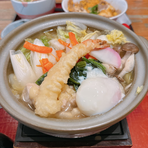 Read more鍋焼きうどんに釣られて入店。固形燃料でグツグツ煮たままでてきてよかった。 うどんはしっかり煮えているが、鍋焼きうどんなので、そういうものかもしれないとは思うが、具材がやや煮えたりない状態で出てきた。 麺はおそらく冷凍麺だが、下手な茹で麺とかよりはよっぽどよいし、ほどよくモチモチしていて普通に美味しかった。 お出汁も、野菜や鶏を煮込むと、風味に奥行きがでて、美味しかった。そのままの状態だと、ちょっと物足りないかも。 天ぷらはサクッとカラッと揚がっていたが、なんだか小さいように感じた。 あと、レジ前の床が異様にベトベトしていたのが嫌だった。 全体的、悪くはないのだが、特段安いわけでもないし、文句は別にないが、すごくリピートしたい...