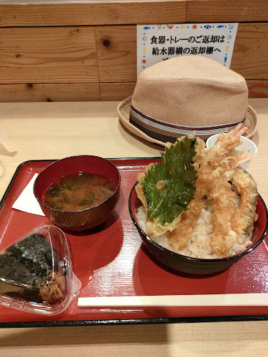 受け取り口で待つことおよそ5分、、揚げたてサクサクの状態で食べられます。お味噌汁(おかわりは50円)とお茶(ウォーターサーバからセルフ)付き。 海老天2本🦐魚天1枚🐟かぼちゃ天1枚🎃大葉天1枚🌿天丼もうなぎも身がふっくら美味しくて満足! 地魚の天丼(こっちも500円)はなんの魚か聞いたのに忘れた⤵