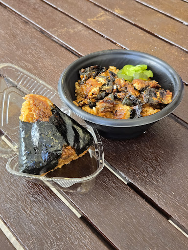 ラグーナ天丼500円(安い!)を注文。レジ横に鰻のおにぎり200円があったので一緒に購入。スマホ決済各種利用できました。店舗ごとで決済方法が異なるようです(現金のみとかpaypayはQR読み込むだったり)。