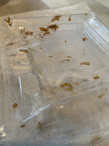 写真は そのプラスチックと 持ち帰りの際に容器から溢れでた油です