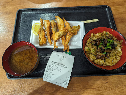 鰻まぶし丼は本当にお値打ち✨ ご飯はタレがからめて?あって後から 気がついたのですが山椒もレシートの下に ありました。 めひかりの唐揚げはこの辺りしか 食べられないらしくて 揚げたてふわふわとっても美味しかったです
