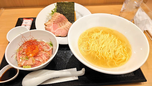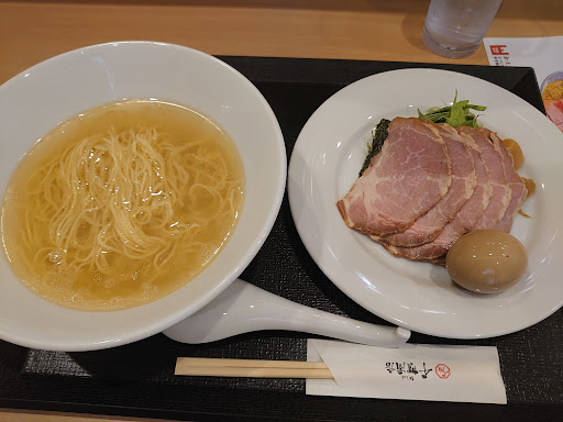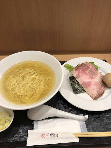 Read more近くの飲食店が軒並み行列の中、同行者が本店を発見。 タイミングが良かったのか一組待ち。その後行列に。 元は隣接した病院(廃院)と提携した調剤薬局を改装した建物になりますね。 三谷町若宮にある割烹料亭千賀、キッチン千賀などを経営する千賀屋(おせちでも有名)の新事業とのこと。 駐車場がアコムと共用なのでちょいと面食らうかもしれません。 ラーメンのベースは醤油と塩(各¥800)。あとそれぞれにレアチャーシューが3枚追加されたやつ(各¥1,000)の4種。レアチャーシュー丼は現在は休止中。単品でレアチャーシュー追加の場合は¥250なのでレアチャーシューを多く食べたい人は確認しましょう。 『レアチャーシュー醤油そば』を注文。 麺はストレートの細麺でしょうか。多分低加水です。 素ラーメンの状態が見えてしまう場合は、もう少し麺の見栄えを良くしたほうがいいかもしれません(麺の並びを揃えるとか)。麺をすくうまで縮れ麺かと思ってました。 レアチャーシューなどのトッピングは丼に蓋のように載った別皿で提供されます。 別皿のトッピングは私的には有りです。自分の好きなタイミングで入れて味変を楽しむことができます。 海苔がチャーシューの肉汁でふやけており、んーって感じでした(改善策は思いつかないですが…)。ラーメンに入れてしまえば変わらないんですけどね。あと、チャーシューを先に入れてそのままにしてしまうとラーメンの熱で火入れが進んでしまって食感が変わってしまうため、レアチャーシューとして食べたいのであればくぐらせる程度で留めておくのが良いでしょう。メンマは自家製でしょうか。味変としては優秀ですが、ラーメンとの一体感としてはちょいと微妙でした。ネギと水菜は良かったです。 味は(私の舌が馬鹿になっていたのかもしれません)感動は感じられませんでしたが出汁を主にされて洗練されていて、くどくは感じず、最後まで問題なく食べることができました。