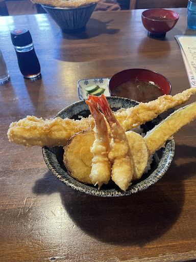 ⚫︎海老天丼(2,000円) ご飯に甘いタレがかかっていましたが、天ぷらには塩かタレをセルフでかけるスタイル。 ・米少なすぎ。大人の女でも足りなかった。 ・天ぷらは衣がサクサクでしたがサイズ感にびっくり。これで2,000円は高すぎでしょ。 "海老天丼"だから海老がメインでインパクトあるのかと思いきや5匹の小さな海老で、野菜は玉ねぎ、長芋、かぼちゃでした。