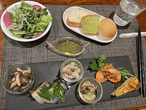 Read moreI got the pasta course (2,500¥) and it was really good! It came with a bunch of appetizers, which they made without meat at my request, a salad, and rolls. You can also get seconds on the bread for free. I also added a cake for 480¥, and they drew a cute Christmas design...