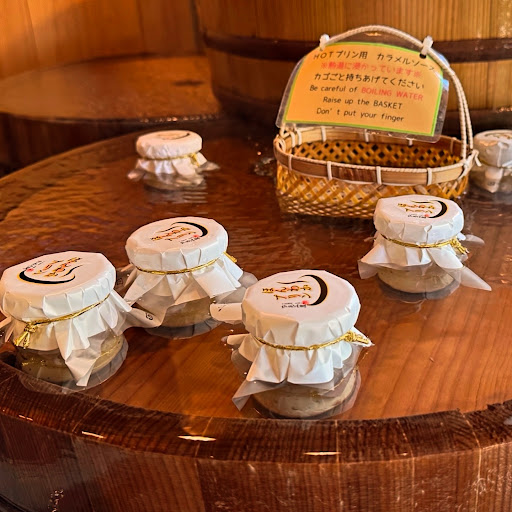 The puddings are all nicely arranged in the spring water. At one point, the water went cold so the girl at the counter fixed it and then offered us complimentary hot puddings since the ones we had gotten were not warm (but still delicious). I also tried the regular matcha one and it was pretty great. They also have a nice sweets collection to take home. It all feels great after some onsen time, what a sweet fun town!...