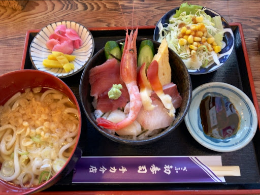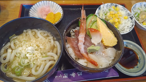 3月初日、平日の13時くらいに訪問も座敷のひとテーブル以外はカウンターもほぼ満席。時間がかかるけどそれでもいいならとテーブルへ促された。 承知し、しばらくして注文。25分くらいで提供された。 サーモン丼はサーモン刺身が8切れほど。アトランティックノルウェーサーモンのように脂の乗った感じではないやつ。海鮮丼はマグロ3切れ、白身3切れ、甘エビ、帆立貝柱、ホッキ貝半切れ、卵焼きにきゅうり。小ぶりだが、この値段でこの種類は嬉しい。下の酢飯は押し付けられた感じで少し固く感じた。味はいたって普通。刺身は鮮度は悪くない感じも美味いという感じでもない。丼が小さめなので、女性にはちょうどいい量なのかもしれないが、揚げ玉いっぱいのうどんがあっても私的には量的に物足りなかった。あとサラダと食後に自家製シャーベットがついて税込800円はとても良心的で頑張っていると思う。店主とお上さんは終始、お客さんに丁寧すぎるくらいに声かけして...