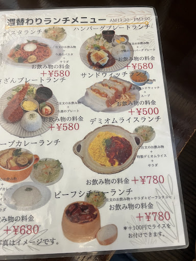 Read more日曜日の昼過ぎに仕事帰りの友人と利用しました。程よく席は空いておりすんなり座れました。 日曜日でしたがランチの注文ができありがたかったです。 入り口の黒板にランチの告知ボードあって、ハンバーグなら何ハンバーグランチ、と記載あります。中のメニュー表には何とまで書かれていなかったので私はボードの文字を席から見直しました。 和風ハンバーグランチをオーダーし、飲み物はアイスコーヒーをつけました。 量は、ライスがプレートにのっていましてお子様ランチ用ライスっぽい感じかな、と。多くはないです。 ランチデザート、というメニューもあって、ランチ食べてからお腹に余裕がまだあり、友人と二人して追加でそれを注文しました。 ドリンクのタイミングを言ってくださいね、とスタッフの女性が途中声かえてくださってたのですがとても雰囲気よく優しい声掛けで。感じよくて嬉しかったです。 おかわりのドリンクは200円引きでできました。 長居してしまったのですが嫌な顔されることなくて、とっても居心地よかったです。 また友人と利用したいと話しました! ...