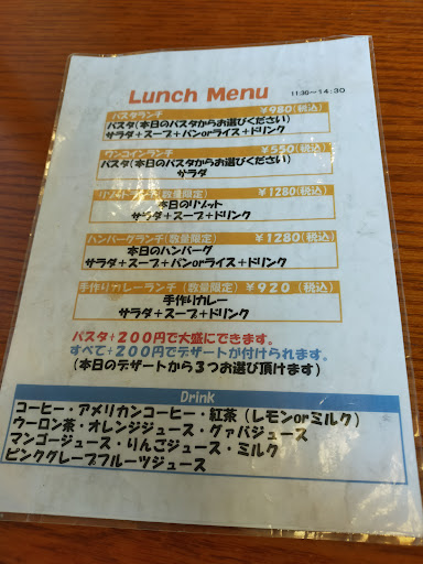 ヨーロピアンな外観で、入口にある黒板には本日のランチメニューが書かれている、パスタやリゾットなどのイタリアンメニューから、ハンバーグやカレーといった洋食も扱っているみたい。