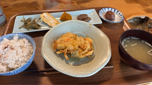 2024/1/25 雪の日の翌昼過ぎに伺う。日替わりランチ(限定10食) 今日は女性のグループが来ていて女子会みたいに居間で会話が咲いていた。親戚の家に訪問した様な平穏な雰囲気である。おしぼりとほうじ茶をおば様に頂く。庭には雪が残っている。