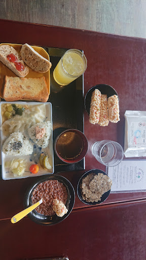 バイキングカウンターの説明を見ながら待つ。 長方形の和盆に乗った基本のモーニングは和風で、ワカメおにぎり二個には、胡麻とシーチキンが乗る。大きめの茹で餃子が美味しい、あんかけ玉子野菜ソースがかかっている。キャベツやズッキーニ、カブ、ミニトマトのピクルス野菜も添えられている。赤だしのワカメ味噌汁の椀に、半切りバタートーストとライ麦パンが2カットはカウンター端のトースターで自分で焼く様である。 バイキングはコップの水や小皿に、自らカウンターからミルクでココア色のグラノーラを入れて作る。他にイワシ煎餅や米を棒に固めた菓子等があり、日々変わるバイキング仕様なのであった。残さず持ち帰らずが基本みたいである。