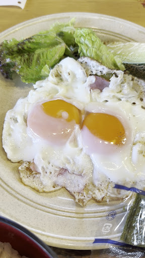 土曜の朝7時半位に夫婦でうかがいました。 写真つきのメニューに、モーニングは定食のような感じで400円~とあったので(飲み物はプラス150円)、500円の鉄板目玉焼きセットと、卵焼きのセットを注文しました。飲み物はつけずに。 数分で届きました。 目玉焼きは両目(2コ分)で、白身はほどよく焼け、黄身は半熟、ベーコンはカリカリで美味しかったです。 卵焼きはほんのり甘め。大根おろしが少し付いていました。 これにサラダ、ご飯、お味噌汁、味のり、お茶がついてきたので、お腹一ぱいになりました。 常連と思われる方々は、このセットでなく、飲み物を注文していました。ゴハンのセットを注文せずとも、飲み物を注文したらサンドイッチやサラダがお皿にまとめてのって無料でつくのかもしれませんが、初訪問で飲み物のメニューはテーブルに見当たらなかったのでよくわかりませんでした。 モーニングがよくわからないのと、トイレのドアの鍵が壊れていたのはちょっと…と思いましたが、...
