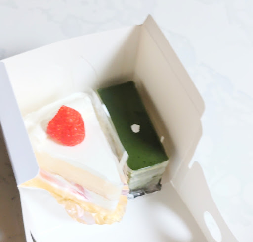 抹茶ケーキ ふわふわじゃないチョコレートクリームと抹茶のしっかりしたスポンジ生地が層になっている。 両者が主張し過ぎずかと言って混ざり合いもしない。二つのコラボがバランス良く和と洋口の中で奏でる。