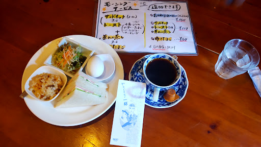 Read more真っ昼間に訪れたのでランチを満喫する客で賑わっていた。見たところほぼほぼ常連っぽい地元民だろう。実に理想的なカフェだこと。カウンター席がないため4人掛けのテーブル席に座った僕は「珈琲だけですがいいですか?」と申し訳なさそうに尋ねると「はい、大丈夫ですよ♪」と女性スタッフが微笑みながら返してくれた。それだけでもホッとしてうれしいものだ。熱い珈琲にバウムクーヘンとピーナツのおつまみが付いた。見渡せば満席。全員がランチメニューを楽しんでいた。地元民にこよなく愛されてる感がてんこ盛りのカフェだった。...