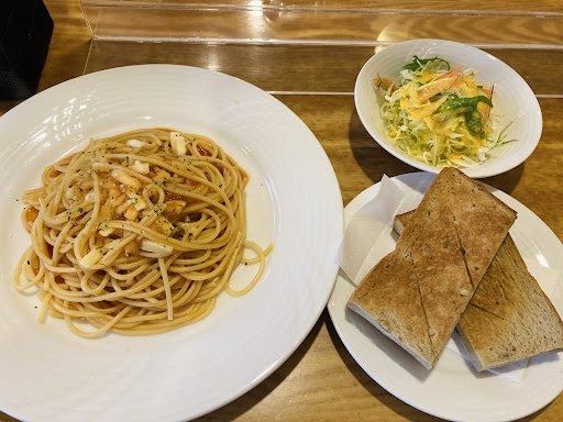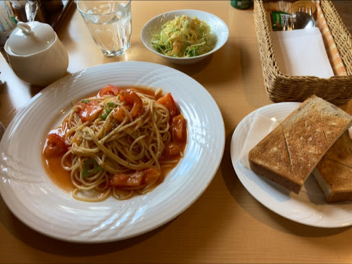 Read more日曜日のランチタイムに伺いました。 サービスセットを注文。 パスタは麺にしっかり塩気がありつつ、あっさりしていて美味しかったです。 セットにサラダとパンがつき、程よい量のランチだと思いました。 看板に″自家焙煎″とあり、気になっていたのでドリンクはブレンドコーヒーを注文。 しばらくするとジャッジャッと音が聞こえてきて、焙煎してくれてるんだ〜と、コーヒー好きとしてはとても嬉しくなりました。