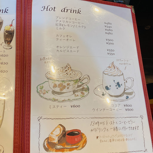 ドリンクは、コーヒー、紅茶500円 カフェオーレ550円などがあります