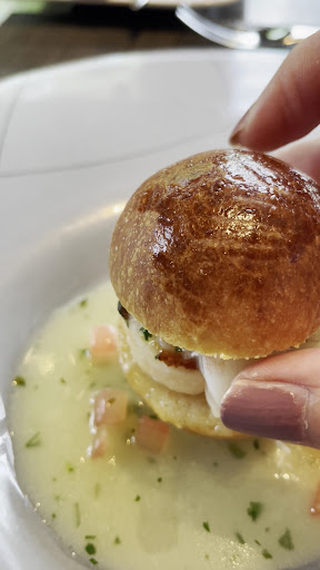 ◎自家製ブリオッシュのハンバーガー風❓ 帆立でサンドして素敵な海鮮ハンバーガー。 ※ソースも絶品なので、パンで拭いとります。