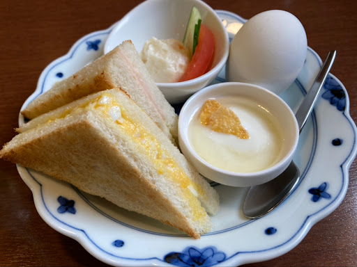 マスターが入れてくれたコーヒーは程よいコクがあり美味しい。モーニングの主食はハムとたまごのサンドイッチ。パンは表面が軽くトーストされていた。その他、ヨーグルトはハチミツとコーンフレークを添えて。ゆで卵はほどよく半熟。バナナでバランスよし。
