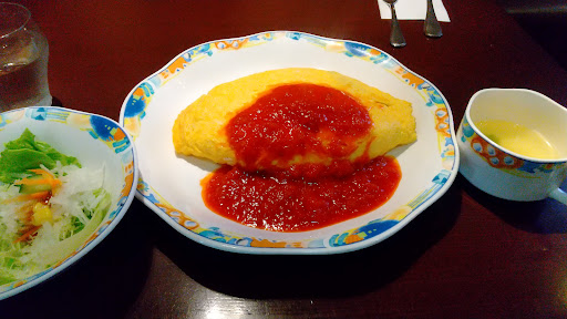 サラダとスープが付いてきます。 オムライスは、火が通っているのにフワフワの玉子に包まれています。食べてみて驚いたのが、中のライスがチキンライスでは無い事。オイリー感の胡椒が感じたので見たら、中はピラフでした。トマトソースは、酸味が効いています。 トマトソースで、中のピラフの味が消されてしまっていたのが残念。中のピラフは、ピーマンとハムが入っていて美味しい。 次回に頼むなら、絶対ピラフです。