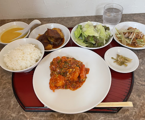かぼちゃのフライ、サラダ、春巻き、大根の煮物、エビチリ、ご飯、玉子スープ、タピオカ入りココナッツミルクが出てきました。 フライ物は、サクサクに揚がっています。 メインのエビチリは、プリプリ海老にマイルドな味付けでした。 玉子スープは生姜が効いた味付けで口をサッパリさせてくれます。 全ての味が、とても優しい味付けです。この地方に多い大陸中華と比べると、食べ終わった後に喉が渇く事も無く安心して子供や老人にも勧められるお店だと思います。 量は女性に丁度良いサイズかな。 12月から値上げとありましたが、クオリティ含め満足できました。 中で働かれている人のキビキビした動きと躾を見て、上の人がしっかりしている証だと思います。 味、接客共に満足でした。