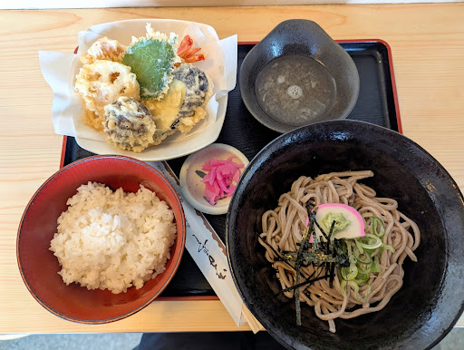 味噌煮込みが気になったけど、店内の暖かさに冷たい麺が食べたくなったので、天ぷら付冷しそば定食をオーダー。間もなくして、たっぷりの天ぷらが付いた定食が登場。こんなにいただけると思っていなくて、内心小躍り。