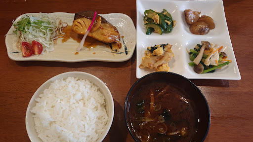 サービスランチ昼定食は600円が12種類以上と色々選べて多種類である。 ご飯、汁、手作り惣菜4品にコーヒー付きと格安の選べる定食ランチが、キュウリ玉子煮、小じゃがいもの煮物、竹輪とワカメ玉子、じめじと野菜等の手作り惣菜が四角い皿に収まっている。 多少小振りでも厚いぶりの照焼きに、谷中生姜が乗り、端に千切りキャベツと水菜、ミニトマトのサラダも添えられている。 濃い赤だしの油揚げとワカメの味噌汁とご飯、更にホットかアイスのコーヒー付きでこの内容は嬉しい。 藁か炭火、生姜の香ばしさが入った脂の乗ったぶりの照焼きが特に美味しい。惣菜の多彩さでもバランスの取れた、...