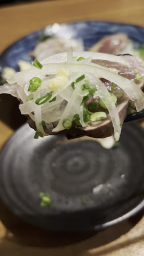 新鮮なお魚を藁焼き 味はついてるんだって 薬味がいろいろあって、どの組み合わせにしよう〜ってなる いろいろな組み合わせを試してみたよ 個人的には柚子胡椒が大好きなので、つい柚子胡椒に頼り気味 でも、鰹は流石にネギと生姜だね ローストビーフの藁焼きってお初♡