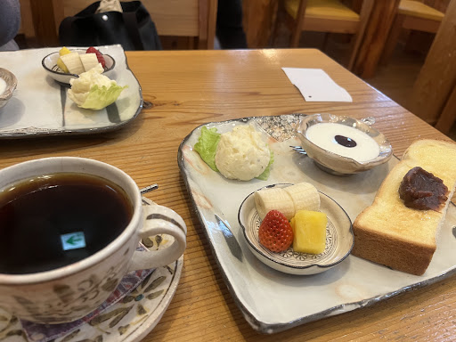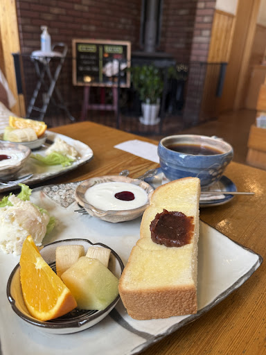 ずっと気になってたお店。 初めていきました。 珈琲専門店というだけあって、席につくと 本日のコーヒー◯◯というカードが。 今日はモカと記載されてました。せっかくなのでモカを注文。 コーヒーが先に届きましたが分厚めの陶器に注がれていました。私は陶器のこと詳しくないのでよくわかりませんが、美濃焼きのギャラリーがあると以前こちらのお店のレビューに載ってたところでいうと、この器に厚みある陶器たち、もしや美濃焼きなのでしょうか? それはさておきモーニングセットの内容、良いと思いました♪ パンに、おぐらはのせていいですか? と注文の際にスタッフさんが聞いてくれて、 私はつけてもらいました。 パンとあとはヨーグルト、ポテトサラダ、一口サイズのフルーツ(バナナ、パイナップル、苺)がワンプレートに取り付けられてましたね。 コーヒーおいしかったです! ワンプレートのほうもおいしく満足しました。 あと、出入り口奥に立派な薪ストーブがあって、寒い日でしたのでそこからみえる赤い炎がかっこよくて、またあったかくてすごいと思いました。 また行きたいと思えるお店。 その後 別日にも行ってきました。 本日のコーヒー キリマンジェロ (酸味が強いとの説明書きあり) 私は酸味の強い珈琲は不得手のため、普通のブレンドをオーダー モーニングセットのプレートは前回と全く同じでした ポテトサラダ、手作りだと思うのですかシンプルだけどおいしい!! 今回スタッフさんに、陶器についてお聞きしました。やはり美濃焼ギャラリー併設されてるだけあって、美濃焼の陶器でした。 こだわり感じますね♪ 二回目訪問も大満足でした。 あっ、お値段はコーヒー500円 アイスのミルクココアは650円 ココアは上に手作り生クリームがかかっていて そのクリームがおいしいとの連れ...