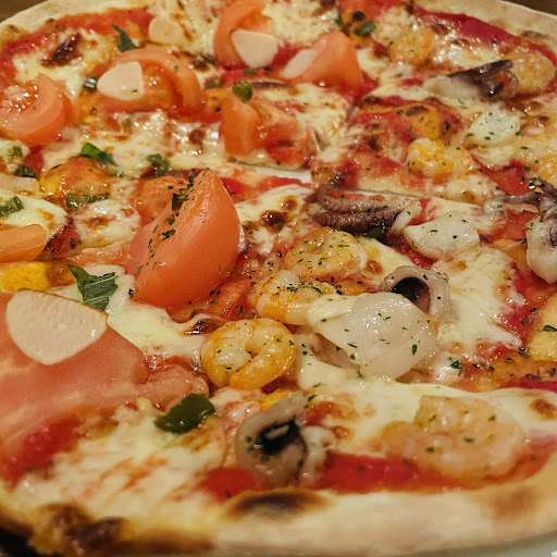 ピザが本当に美味しいです。 ブルスケッタとシーフードのハーフ&ハーフピザを注文しました。 焼きたての薄焼きピザは具材を存分に楽しめる逸品です。 ブルスケッタは大きなトマトとスライスガーリックが決めてのピザで、美味しいです。 シーフードピザは具材がたくさん乗っており、本当に気に入りました。 あまりの海鮮の多さに、私の胃袋とタコ&エビで大海戦でした。 ナーンチャッテ!違うか!!