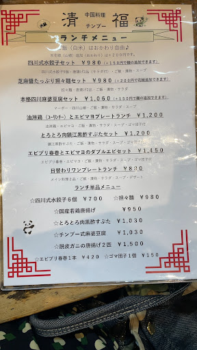 【四川ザーサイ】 ザーサイときゅうり、ナッツを和えた一品。まずはこいつとビールはマスト。 【チンプー特製スパイシーポテトフライ】 唐辛子と花椒でポテトフライを炒めた一品。唐辛子の辛味と花椒の痺れが絶妙!お酒を飲む方には超おすすめ。 【四川式水餃子】 辛味を抑え甘味が感じられるタレは辛さが苦手な方でも食べられる。芝麻醤を効かせ甘酸っぱいタレはご飯にかけて食べると絶妙に美味しい。 【脱皮蟹唐揚】 軽い衣でさっと揚げて少量の塩のみで味付けする事により殻ごと食べられ旨味がます一品。 【とろとろ肉黒酢すぶた】 豚ばら肉の塊を4時間も煮込んで寝かせ、注文ごとに揚げる。角煮のように柔らかく黒酢の酸味が絶妙。 【チンプー式麻婆豆腐】 2種類の醤油や豆板醤を巧みに組み合わせて、山椒油を忍ばせた麻婆豆腐。私的麻婆豆腐No.1は未だ破られず。 【南高梅のチャーハン】 この日のおすすめメニュー。長芋がいいアクセント!やっぱ白米で作るチャーハンがうまいわ。