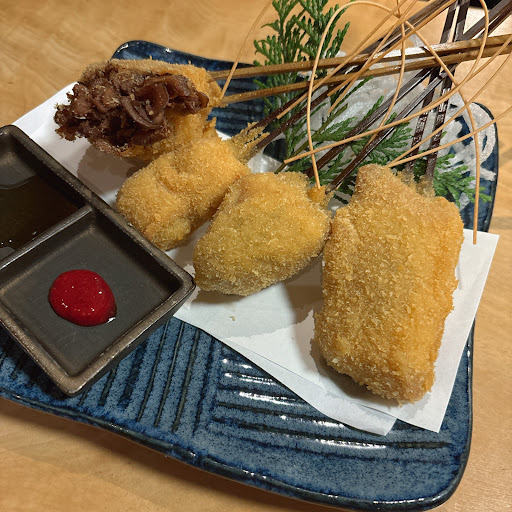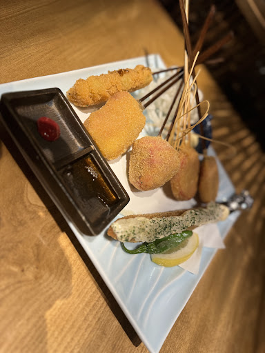予約をして入店したので個室で食べれました。 店内入って直ぐ正面にカウンター席とテーブル席ぐあり、全体を見渡せるので個室がオススメ! おでん🍢が有名でいくつか注文。薬味に甘い赤味噌やカラシや七味があったけど、柚子胡椒やブラックペッパーなど他にも楽しめると嬉しいかな! 串は定番の串カツからアスパラ肉巻きやカキフライと創作系が沢山あって美味しかったです。 だし巻き玉子は2種類とも注文!どちらも美味でした✨カニクリームコロッケはアツアツ、トロトロで美味しい😋誕生日会でケーキを持ち込みしたんだけど、快く受け入れてくれて、花火まで付けてテーブルまで持ってきてくれました。人数分のカットもしてくれて写真も撮ってもらいbirthdayサプライズ🎂大成功でした。 飲み放題はノンアルコールとアルコールとで、人数分けて注文できるのはありがたい。 ホットドリンクが全てぬるかったのが残念😔 ドリンクや料理の提供後に、お皿やコップを下げるのが出来る子と出来ない子で分かれて、こちらから下げてもらう事を伝えたのが少し残念。 トータルでは美味しく楽しめたのでまた機会が...