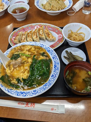 2022/10/某日 再訪 今度はランチの混雑している時間帯にお邪魔してしまいました。 料理人さんたちめっちゃ、忙しそう。 お客さんも、私みたいなお一人様も多くカウンター席が次々と埋まっていく。急がねばと、カウンター席に着席。 今日はお得でボリューミーなセットを頼もうとセットメニューを見ていたら、王将初心者だとバレたのか、配膳してくれているお姉さんがセルフなのに再びお水を置いてくれた。優しい。 王将の天津飯がとても美味しそうだったので、天津飯セットをオーダー。 ラーメン(しょうゆ) 天津飯(ミニサイズ) 餃子 がセットになって、なんと998円というお得過ぎるセット。 お腹を空かせてきたので、今日は食べるぞw 5分ほど待機してると、注文の品がドンと目の前に。 料理人さんたち早業…w ずっと食べて見たかった天津飯は卵がトロトロ。 ふんわり柔らかい味の天津飯は、あまり甘さはないけれど出汁の味がしてとても美味しい。 ラーメンは王道 裏切らない美味しさ。 しょうゆ味の汁もとても美味しく麺に絡んで食べやすい。 餃子は流石。 食べやすいサイズでかつ、しっかり身が入ってて、にんにくの香りが軽く鼻に通っていく。皮もむちむち。 ああ、幸せ。1000円以下でこのクオリティ流石過ぎる。 また近くに来たら絶対寄ろう。