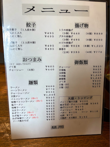 Read more平日の夜営業に行きました。時間は6時30分くらいでしたが、私一人で空いていました。25年ぶりにお邪魔しましたが、やはり、美味い。 五目ラーメンと天津飯と唐揚げ3ケを注文しました。 ラーメンは、まず熱々が良い。味は勿論、細麺だから更に美味い。 唐揚げも大き目で美味い。 あと、天津飯が白い餡、これが他では食べれないんですよ。勿論、安定の旨さ。 よく、口コミで待ち時間が長いとコメントを拝見しましたが、正直美味しいお店では当たり前かと思います。2人営業の繁盛店なんて沢山あります。 皆、文句なんて口コミにありません。 だって食べたいなら待つのが普通です。 タイミングは誰でもある事。 駄目な時は日にちを変えるだけ。 そうやって、客も対応するべきです。 お店にはお店の事情があると思います。 そうやってお店に協力してあげるのも客の義務かと思います。変わらない味をありがとうごさいました。頑張...