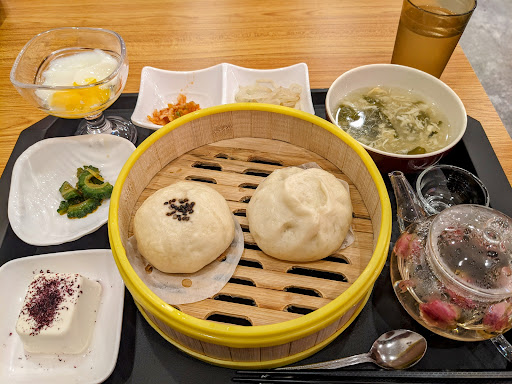 店内入口の券売機で購入 【中華朝食 / 500円】9:00〜14:00 ランチメニューも注文出来ます。 (ご飯おかわり無料) ★中華朝食 (ナムル・春雨・杏仁豆腐・大根キムチ・搾菜 スープ・肉まん・南瓜まん・バラ茶) 小さな器に少しづゝ色々な味が楽しめて嬉しくなる朝食でした。 これで500円はとても嬉しい...