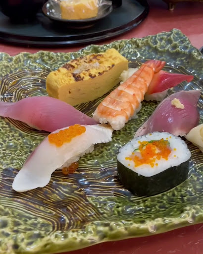 お寿司は,海老、まぐろ、ホッキ貝、白身,卵、鰹,巻き寿司