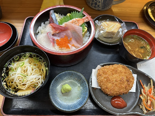 Read more初めての訪問でございます。 お寿司屋さんですので、魚介に期待をして参りました。 海鮮丼¥1100をお願いいたしました。 出てきた料理を見て、ありゃりゃと嘆息した次第でございます。 海鮮丼単独の提供かと思っておりましたら、他店でも良くあるパターンではございますが、にゅうめんとコロッケが付いているではございませんか。 肝心の海鮮丼は、期待していた山盛りの魚介ではなく数個の切り身でございました。 いやあ、私はにゅうめんとコロッケはいらないので、ほんまもんの海鮮丼を食べたかったなあと思った次第でございます。 コロッケはバリッと揚がっていておいしかったのですが。 メニューの価格は、今は税込みで書いておかないとルール違...