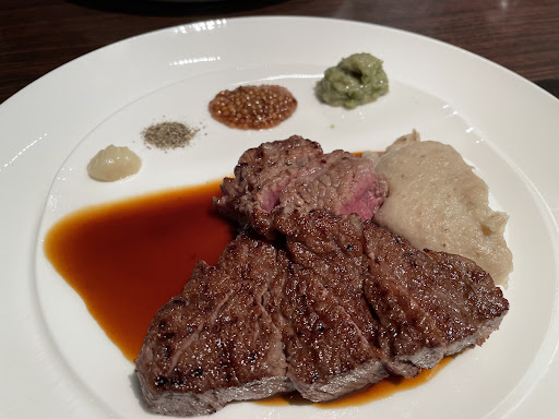 私達夫婦は野菜のあとスープ、前菜、鯛のソテー、シャトーブリアン、栗ご飯とお味噌汁、お漬物、デザートのフルーツまでいただきました。 もう、お腹パンパンで苦しくなるくらい。 特にシャトーブリアンは柔らかくて溶けるような美味しさ。ソースもとてもいいです。 あと3種のお米をブレンドした栗ご飯は香りが最高で甘味もあり、お腹パンパンにもかかわらず、おかわりしてしまいました。ホントに日本人でよかったーっていう味のご飯。よかったです。残ったご飯はおにぎりにしていただきました。 お味噌汁、お漬物もとてもいい味。